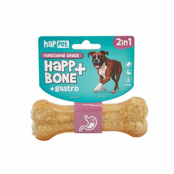 Happ Bone + Gastro to funkcjonalny gryzak opracowany dla psów z wrażliwym układem trawiennym. Producent postawił na prosty, dobrze tolerowany skład, który łączy przyjemność gryzienia z realnym wsparciem pracy jelit i żołądka.