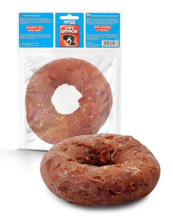 Smaczna przekąska dla dużych i średnich psów. Duże krążki ze skóry wołowej owinięte mięsem z piersi kaczki. To przysmak bogaty w białko i naturalny twardy gryzak, który dostarcza psu długotrwałego zajęcia, jednocześnie dbając o zaspokojenie potrzeby żucia i chroniąc przed odkładaniem kamienia nazębnego.