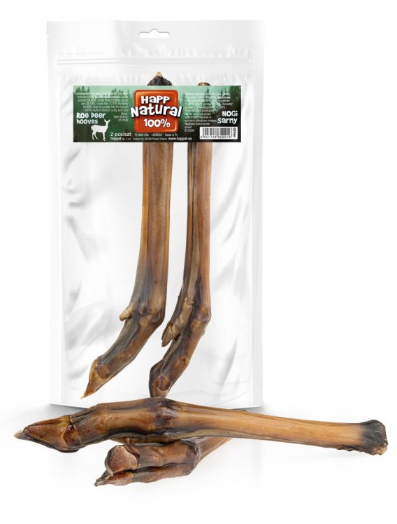 Nogi sarny to w 100% naturalny gryzak, idealny dla psów ceniących wytrzymałe i długotrwałe przysmaki. Kopyta sarny dostarczają intensywnych doznań żucia, wspierając naturalną potrzebę gryzienia, a przy tym pomagają w utrzymaniu zdrowych zębów i dziąseł.
